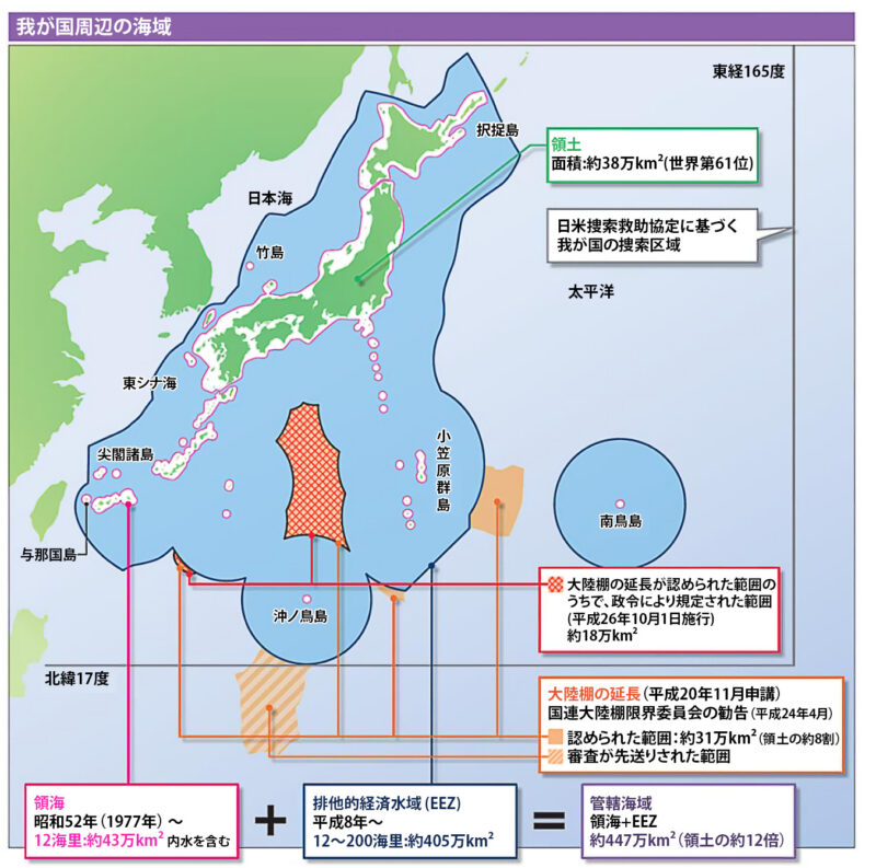 日本の領土面積は約38万K㎡で世界第61位に位置するが、領海を含むEEZ(排他的経済水域)は