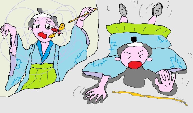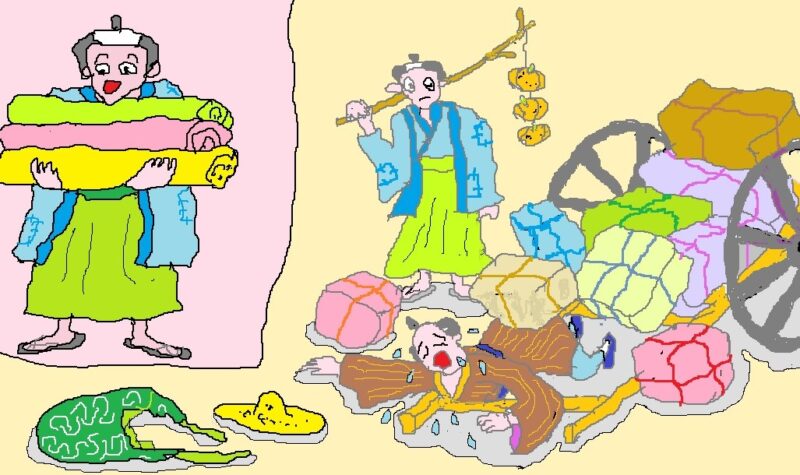 男は蜜柑を木の枝に結び付けて歩いて行くと、大八車を引いた商人が、息もたえだえにハアハア苦しがって、ばったり倒れた。商人は顔を上げて蜜柑を指さした。どうやら喉がカラカラのようだ。