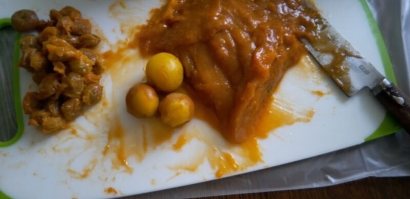 (種は堅い。包丁をすべらせて指をケガしないよう気を付けなければならない。)