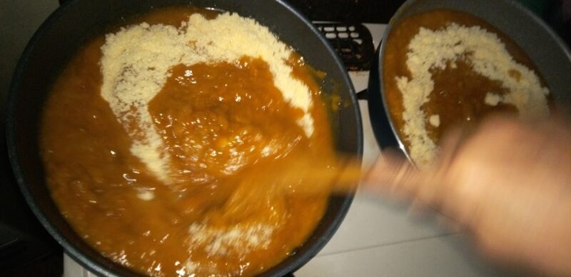 (大量にいっぺんに作るので、3つのコンロで同時進行。焦がさぬようにかき混ぜ、灰汁取りもあるから結構忙しい。)