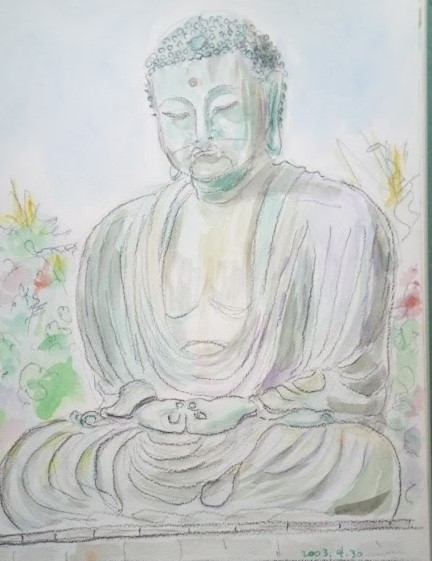 朝から暑かった。大仏様の斜め前の日陰になる木の下で大仏さまを描いていた。そろそろ絵も完成というとき、5人の女の子がためらいながらやってきた。小学6年生で埼玉県越谷から修学旅行で来たという。
