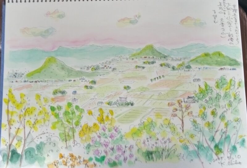 翌日、甘樫丘-あまかしのおか(147M)にのぼって、大和三山を描くことが出来た。