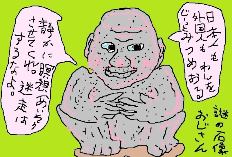 飛鳥駅に近いところまで行くと欽明天皇陵があり、裏手の藪に奇妙な石像を四つ見つけた。日本人観光客に交じり外国人もカメラのシャッターを切っているが、女、山王権現、僧、男と名付けられた石像を代わる代わる見ているうちに、僧の前で足が止まった。この僧はどう見ても微笑顔で瞑想しているように見える。さて、このお坊さん、目を開けたら開口一番何を言うであろうか、吹き出しをつけてみた。
