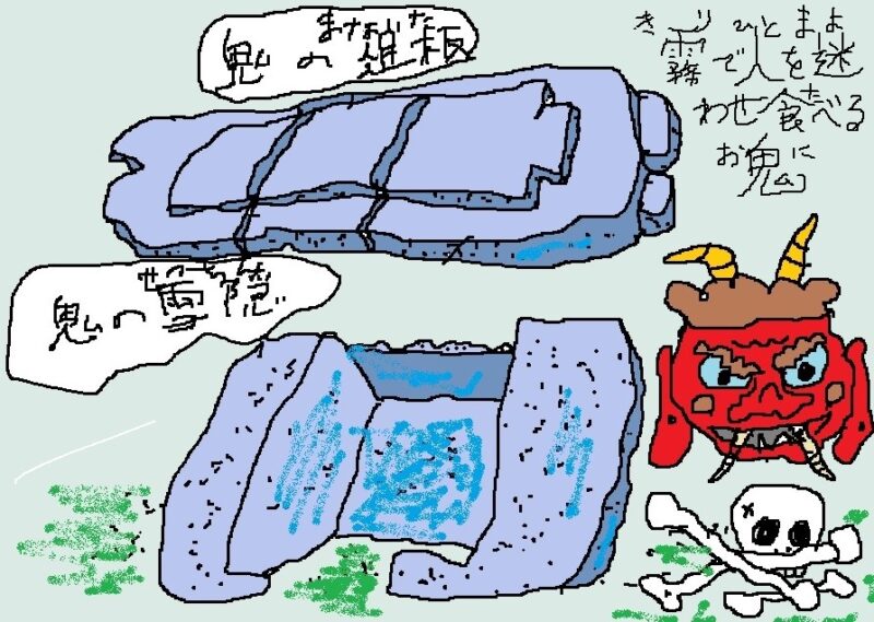 また南に行くと鬼の俎板(まないた)、鬼の雪隠(せっちん)があった。霧で惑わし人を料理して食べたという。さてさて、人間の味は美味しかったろうか。