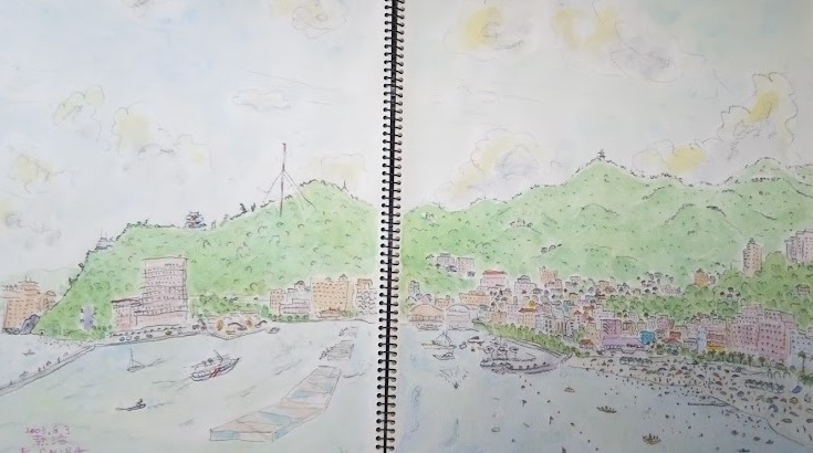泊まったホテルのベランダから熱海の全景が見えて、見開きでスケッチした。