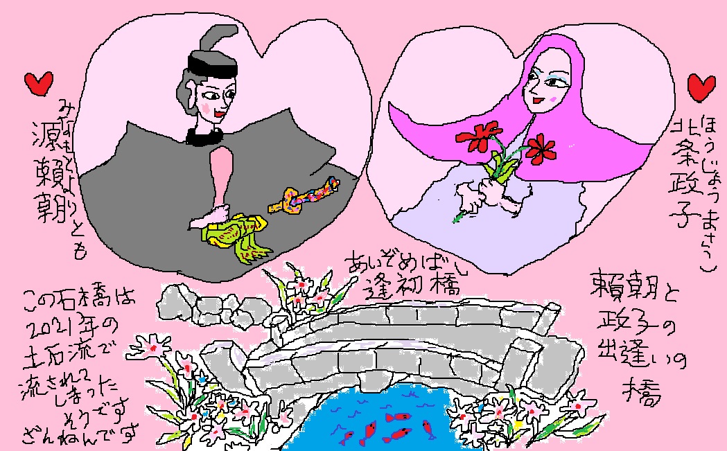 婚礼の夜、政子は全てを捨てる覚悟で酒宴を抜け出し、日金七里(十国峠)を超えて、伊豆山に逃れ、足川の地に隠れ住みました。そして、伊豆権現(走湯権現ー現在の伊豆山神社)の坊にいた頼朝は部下の知らせを受け、逢初橋(あいぞめばし)の上で政子と劇的な対面をしたと言われています。