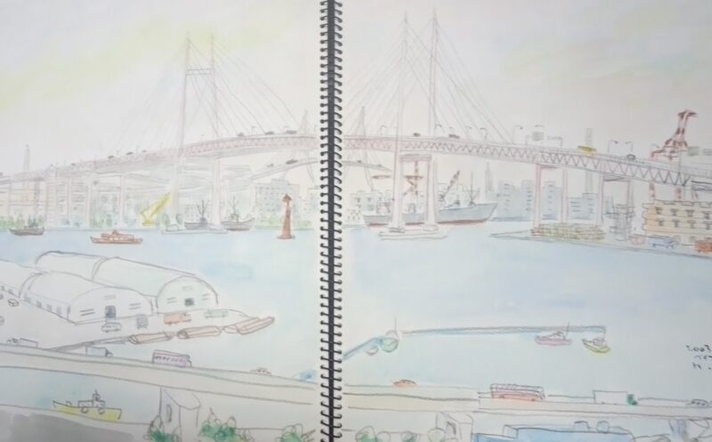 2003年7月15日 横浜港に来てベイブリッジを描いていた。