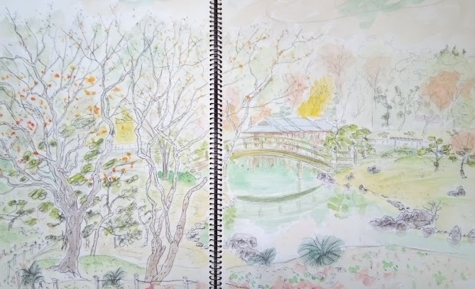 海側を背にして、潮入りの池を見ると、さっき、ご馳走になった中島の御茶屋が見え、手前の中の橋が良い構図になっているので、腰をおろし、スケッチを始めた。