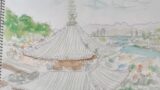 海側を背にして、潮入りの池を見ると、さっき、ご馳走になった中島の御茶屋が見え、手前の中の橋が良い構図になっているので、腰をおろし、スケッチを始めた。