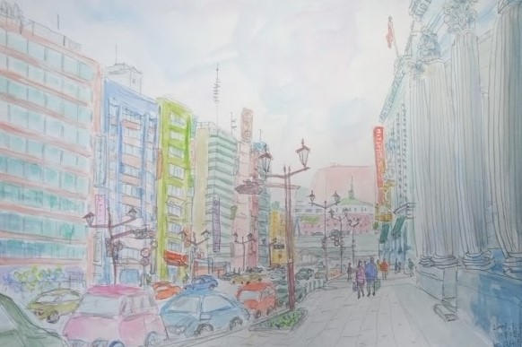 今から20年ほど前、中央通りを銀座に向かって歩いていたが、三井本店の石柱と三越本店の赤の垂れ幕が気を引き、絵になりそうだったのでスケッチすることにした。店頭のライオンも入れたかったが、店前で描くと、営業妨害になるので遠慮した。100m手前の歩道に持参の軽量アルミ椅子に腰を下ろすと描き始めた。「あら、こんなところで絵を描いてらっしゃる?素敵ざますこと。」