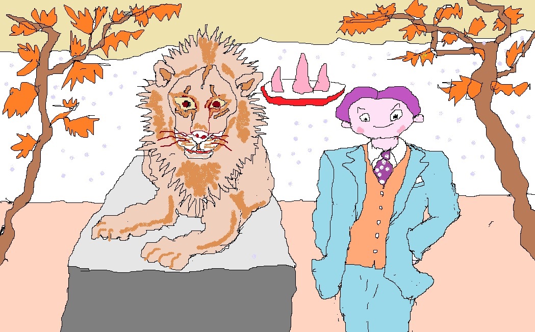 みんなが、良く似合う、20歳は若く見えるというから、調子に乗って、こっそり夜中にライオンをお借りしてぼくはライオンと並んで記念撮影をした。その時に描いたイラストである。(夜中に起こされライオンさんは眠そうだったけど最後まで付き合ってくれた。ありがとう。)