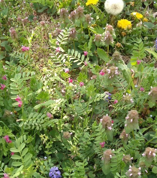 (我が家の庭。右下に群生しているのがヒメオドリコソウ)