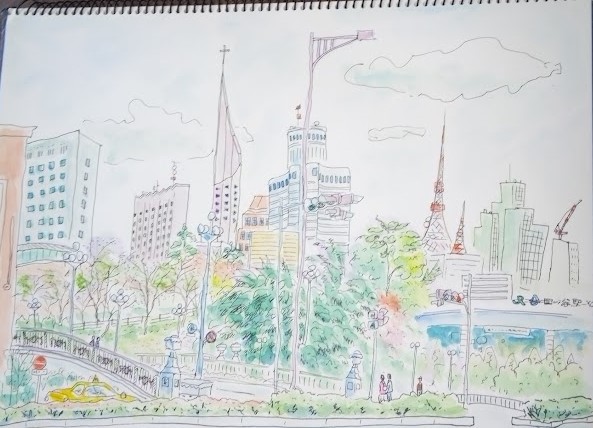 2003年4月13日。今から20年前、新宿区四谷見附交差点の、歩行者の邪魔にならない場所にキャンバスをたててスケッチをした。